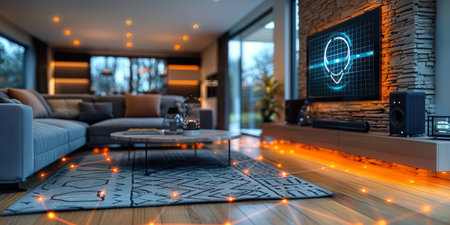 Smart Home Setup: A living room equipped with the latest smart home technology, including voice-controlled devices and automated lighting. Generative AI