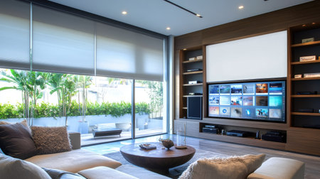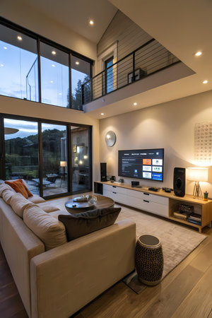 A contemporary living room with smart home technology, including automated blinds, integrated lighting control, and a sleek entertainment system.