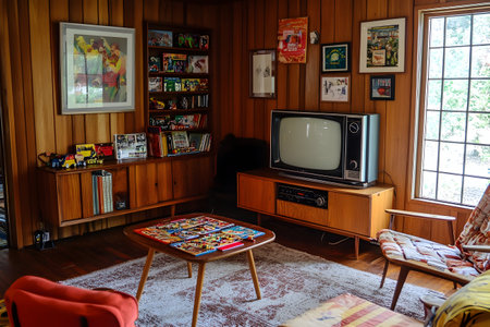 Retro Living Room with Vintage TV and Vinyl Records for Nostalgic Interiors