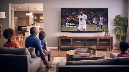 Generative AI : Young african american family couple disagree on tv channel choice excited black man watching football match holding remote control and ignoring annoyed bored girlf