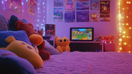 Child gamer room filled with plushies, gaming posters, a Nintendo Switch setup, and cheerful LED lights