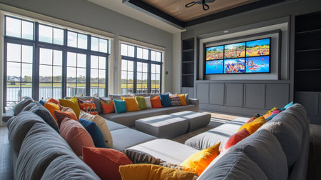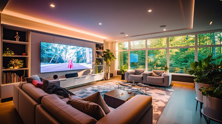 The Media room of a beautiful bright modern style house. AI Generated.