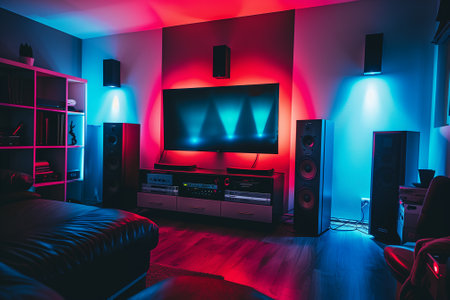 Surround sound system with ambient lighting in a high-tech home cinema. Dark room with neon lights. Generative AI