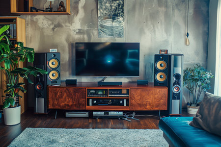 A modern living room setup with a sleek soundbar and speakers placed around a flat-screen TV, creating a home theater ambiance