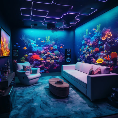 The living space showcases a modern design with plush seating, a vast screen displaying a vibrant underwater scene, and soft natural light illuminating the room, creating a tranquil atmosphere.