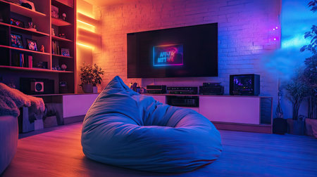 A large, comfy bean bag chair in a home entertainment room, surrounded by gaming consoles and colorful lights.