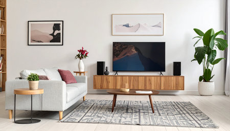 The cozy living area features a sleek TV cabinet with high-quality speakers flanking a flat-screen television, complemented by potted plants that enhance the inviting atmosphere.