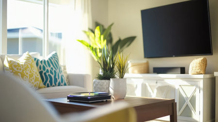 Bright living room featuring a cozy sofa with decorative cushions, stylish TV console, and lush indoor plants, all bathed in natural sunlight for a welcoming atmosphere.