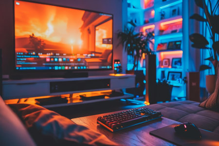Modern living room with ambient lighting and large screen