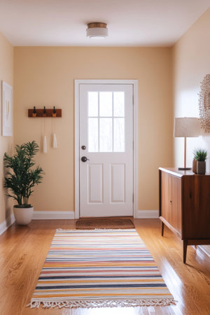 A photo of an entryway with light wood floors, white door and walls painted in soft yellow color, a small rug on the floor with colorful stripes is placed next to it, there's also a modern sideboard cabinet near entrance door, the scene has natural lighting, creating a warm atmosphere. The focus should be on showcasing the wooden flooring and interior design elements like carpet, furniture, lamps, decor, and window details. --ar 2:3 --v 6.1 Job ID: 8a2ef86d-745e-46a9-962e-8979ab5a22ca