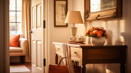Autumnal hallway decor, interior design and house decoration, welcoming autumn entryway furniture, stairway and entrance hall home decor in an English country house and cottage style idea