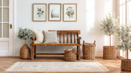 A bright and airy entryway features a wooden bench decorative pillows woven baskets and a stylish rug. Natural light floods the space highlighting the minimalist decor and inviting atmosphere.