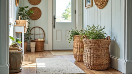 Cozy entryway with wicker baskets and plants enhancing natural decor. That the image is generated using AI.