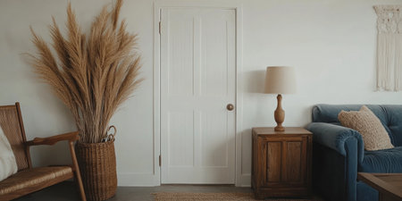 A white wall with a living room interior design, featuring a sofa and side table in a boho-style decoration. The room has a blue couch, a brown carpet on the floor, a wooden coffee table, a white door, a wooden armchair, a lamp, and brown pampas grass in a vase. On the left side of the picture, there is a brown flower basket. The background is white, and the image is a high-resolution, high-quality, hyper-realistic photograph with cinematic lighting and ultra-detailed elements. --ar 2:1 --v 6.1 Job ID: 8ce6ef6e-5629-4334-aa85-e51603a7cede