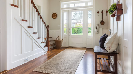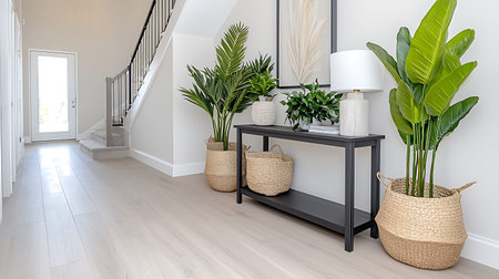 Stylish and minimalistic entryway with natural decor elements during bright daylight hours