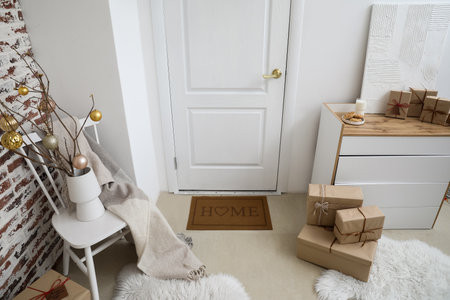 Interior of living room with white door, drawers and Christmas presents