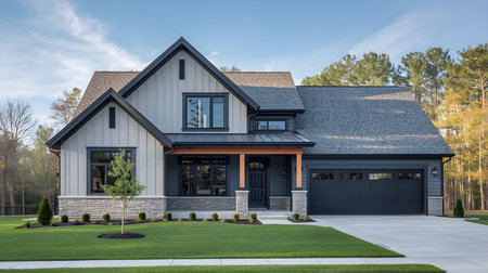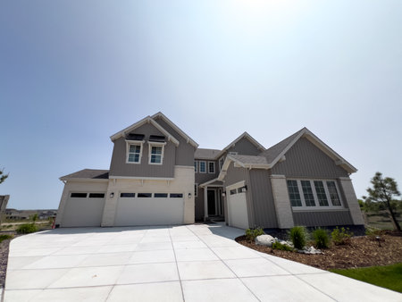 A large suburban house with stone and siding finishes stands on a clean concrete driveway. The bright day lighting emphasizes the crisp architectural lines and manicured landscaping.