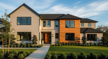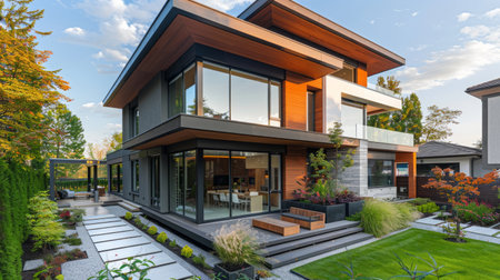 A contemporary home exterior with a sleek design, large windows, and a beautifully landscaped yard