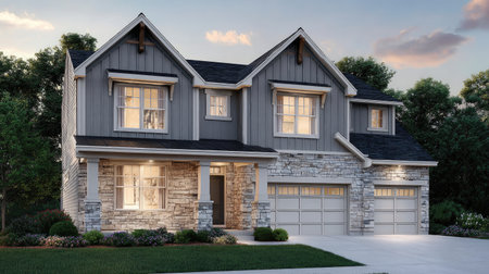 An elegant two-story home with stone accents, a double garage, and a manicured garden. The house is lit up as dusk settles, with warm light...