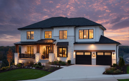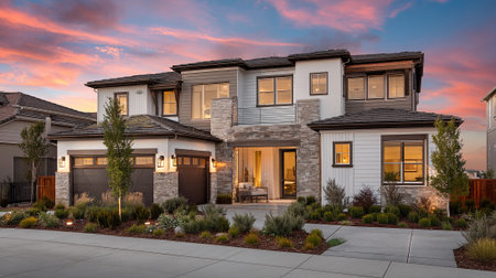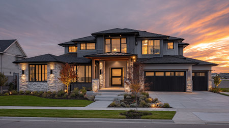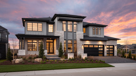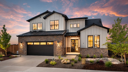 Beautiful Two-Story Home with Black Accents at Sunset for Real Estate