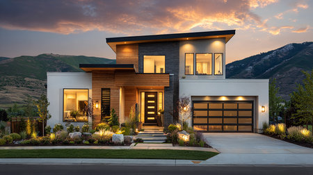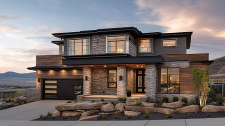 Beautiful contemporary home exterior with stone and wood in Utah during twilight