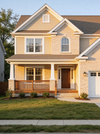 A well-designed two-story house with a dark roof and white siding is showcased at sunset. The image displays a well-maintained green lawn, with warm sunlight illuminating the house. The photograph could be used for architectural, real estate, or lifestyle content, providing a sense of home and comfort.