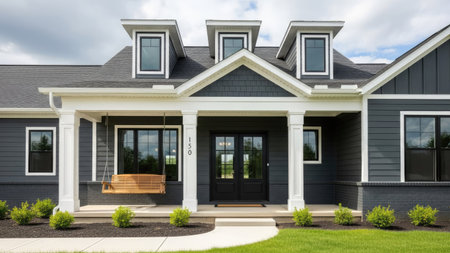 This stunning modern single-family home features an elegant exterior, vibrant landscaping, and a welcoming porch, perfect for family gatherings and relaxation in a serene setting.
