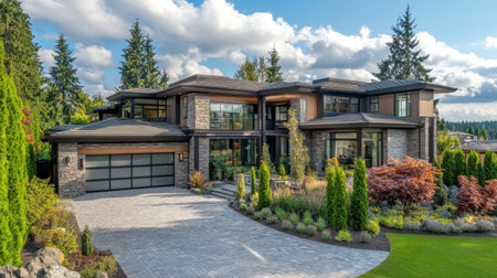 Luxury house exterior with garage and driveway. Northwest, USA