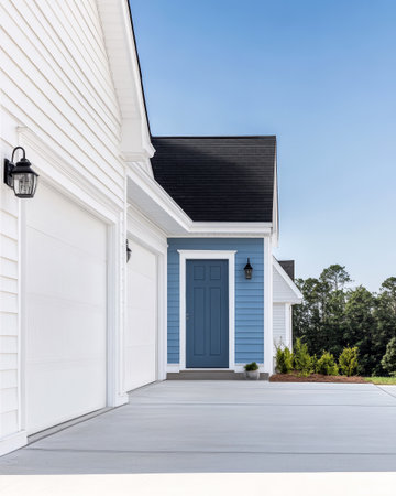 A modern house with white siding features a striking blue door. The garage doors and pathway are clean and inviting under a clear blue sky surrounded by greenery.