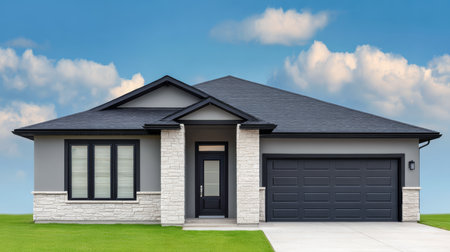 A modern suburban house features a two-car garage, stone trim, and a minimalistic landscaped front yard. The driveway is clean and wide under a clear blue sky.