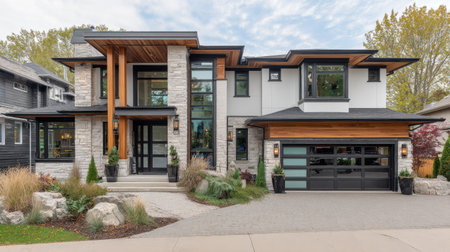 This image showcases a modern two-story house with stone accents on a bright day. The composition features clean lines, architectural details, and landscaping. The exterior presents a welcoming entrance and includes a garage. This imagery is suitable for commercial uses, including real estate and design presentations.