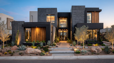 Ultra-modern home with sharp architectural angles, dark color scheme, and a beautifully landscaped front yard. Copy space.