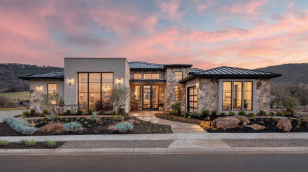 Modern home exterior showcases elegant architecture with beautiful landscaping under vibrant sunset skies.