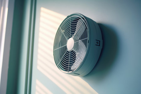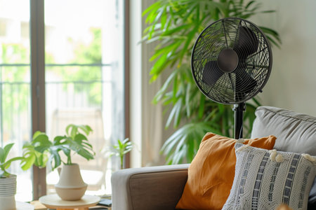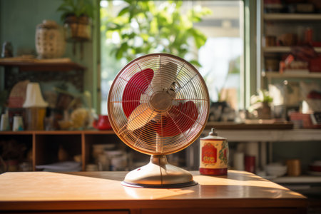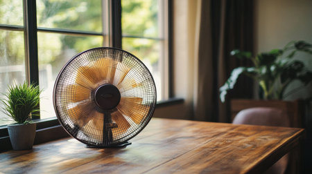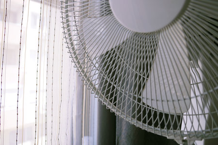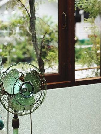 a working fan stands on the windowsill of an open window on a hot summer day.