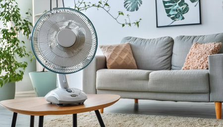 Modern fan with a glass of water on the table at home. Concept of abnormal summer heat and thirst