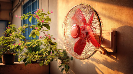 A portable fan provides a refreshing breeze in a lush garden adorned with blooming flowers during late afternoon.