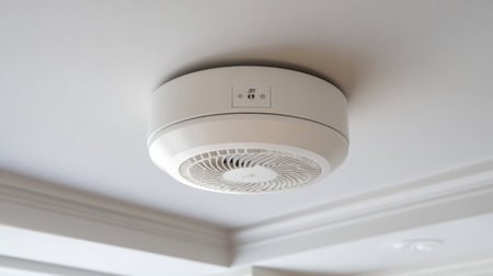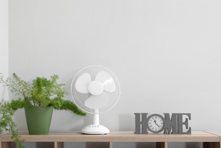 Interior of light living room with clock, houseplant and modern fan on shelving unit