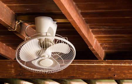 Old ceiling fan hanging under wooden wicker roof, asian style