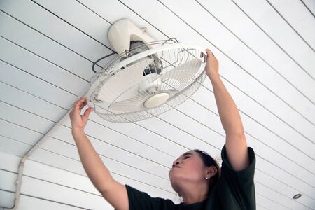 Hand of Young man touch and adjust on front grills of electric fan for a good wind in his home in summer of april in Thailand.