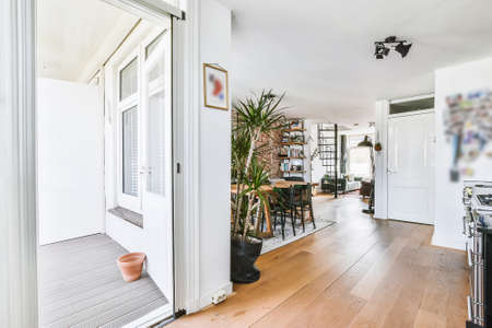 interior of stylish living room with a balcony next to the kitchen room