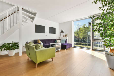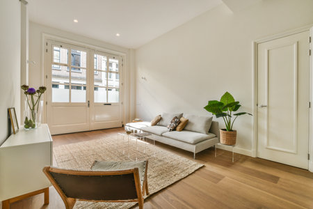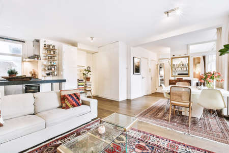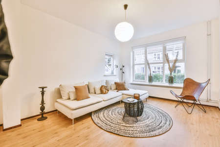 Interior of bright living room with stylish furniture
