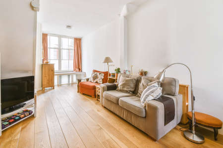 Comfortable sofa with cushions placed against light wall with TV and decorations in modern loving room