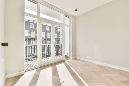 Spacious empty bright room with a parquet floor and large windows in a modern house
