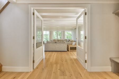 a living room with hardwood flooring and white trim on the walls there is an open door leading to another room