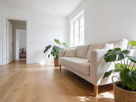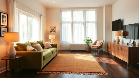 Scandinavian style apartment interior. bright yellow warm colors. wooden flooring. sunlight in large windows.