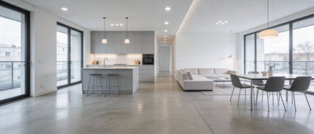 interior of a modern house, living room with kitchen and dining area
