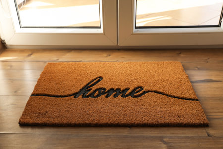 Doormat with word Home on parquet floor indoors