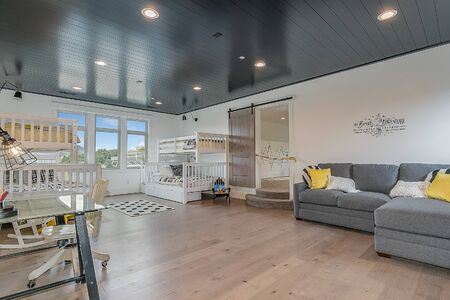 Large spacious bedroom with bunk beds, sofa and desk
