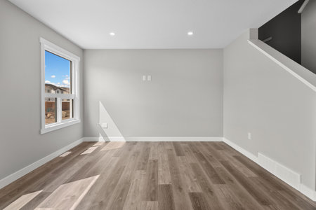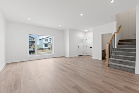 Large open living room with a staircase leading to the second floor. The room is empty and has a clean, modern look