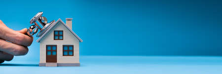 Small house made of wooden blocks on a blue background. Suitable for an article or advertisement on the topic of real estate, insurance, rent or sale.